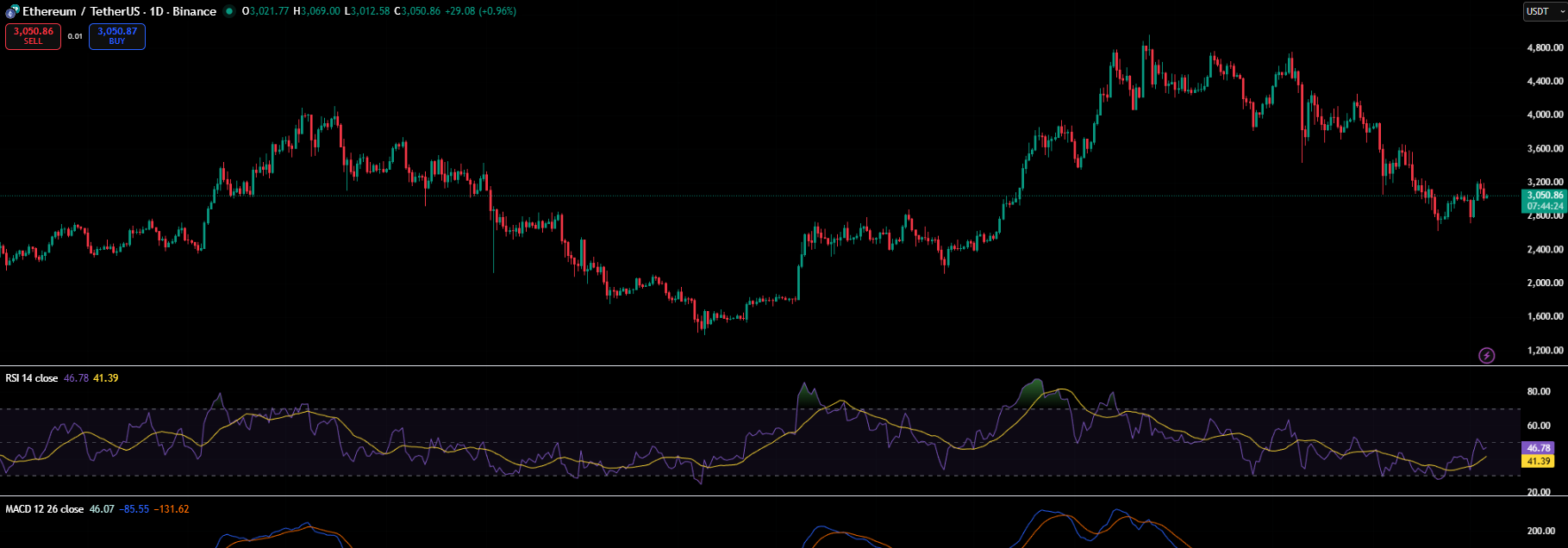 皮肉なことに、BitMineはテクニカル的には脆弱な市場に買い向かっています。イーサリアムは過去1か月で10%以上下落し、現在$3,000付近です。日足RSIは中立圏――売られ過ぎでも強気でもなく――MACDのモメンタムもフラットで、明確なトレンドよりも市場のためらいを示しています。