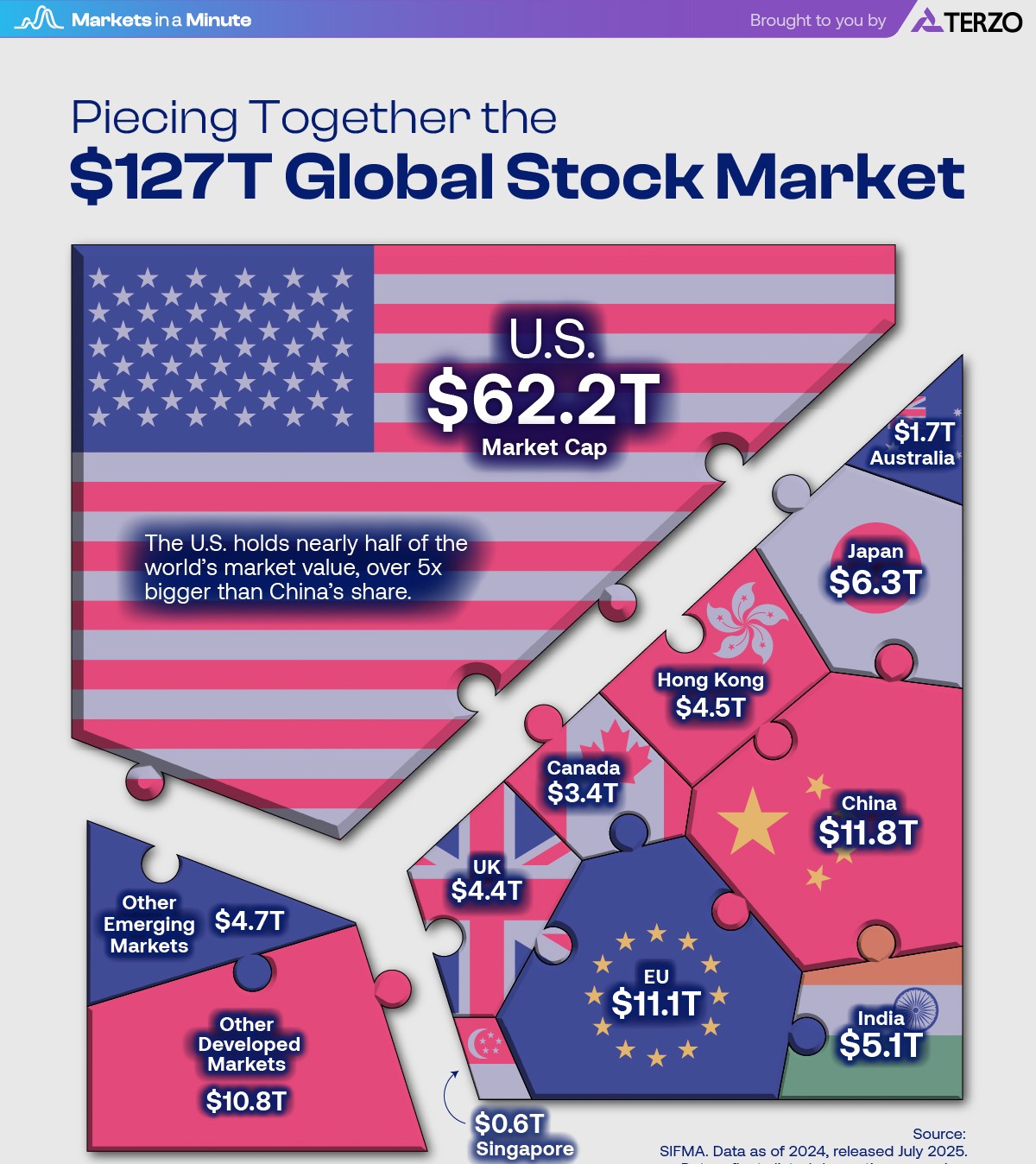 米国株式市場の価値は約(兆ドルで、世界株式市場の48%を占める。一方、EU株式市場の累計価値は約)兆ドルで、世界シェアの9%にとどまる(Visual Capitalist調べ)。