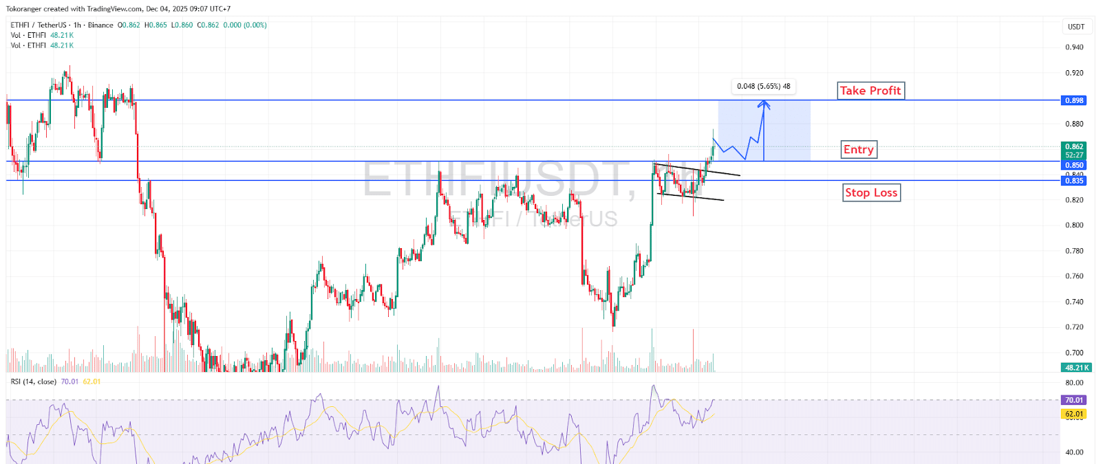 ETHFIは現在、$0.85~$0.86のレンジでブル継続パターンを形成し、きれいな上昇シグナルを示しています。トレンドラインを突破したローソク足は買いモメンタムの強まりを示し、RSIも60を上回っており、ブル相場初動の“燃料”となる傾向です。価格が$0.850エントリー水準を維持する限り、ETHFIは$0.898の強力なレジスタンスまで上昇を続ける可能性が高いです。