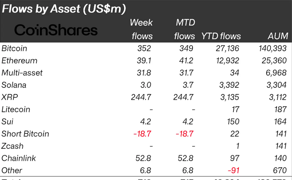 XRPは2番目に好調な資産となり、 先週の流入は2億4,500万米ドルに達し、年初来の流入総額は31億米ドルとなり、2024年に記録された6億800万米ドルを大きく上回りました。