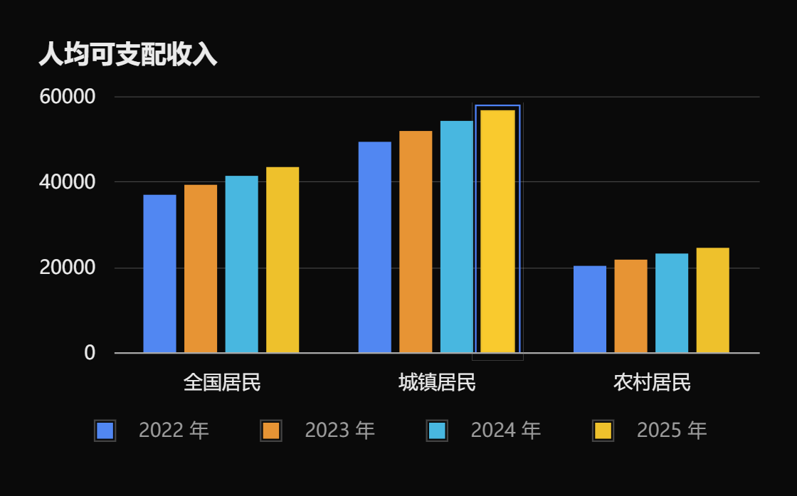 公式目標は2035年までに現代化をほぼ達成し、一人当たりGDPは中等発展国水準に到達、これに伴う一人当たり所得は約2.3万~3.5万ドル。2025年の全国住民一人当たり可処分所得43,377元と比較すると、中長期的な向上余地は非常に大きい。