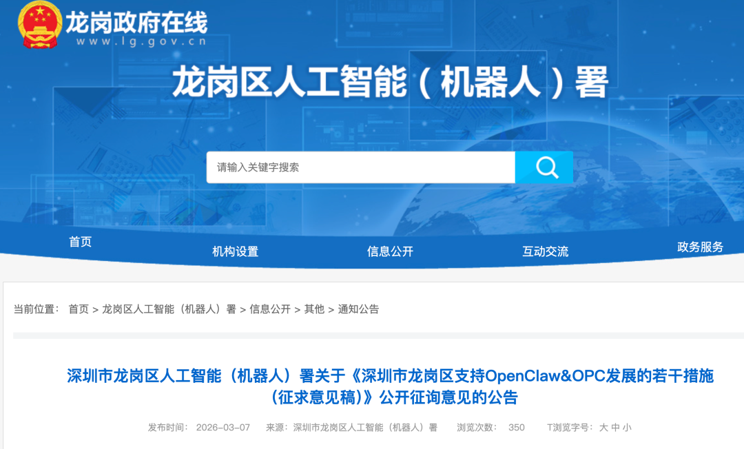 Recently, the Longgang District Artificial Intelligence (Robotics) Office in Shenzhen announced the “Several Measures to Support the Development of OpenClaw & OPC (Draft for Comments)” (hereinafter referred to as “Several Measures”), aiming to seize the opportunities of mass production of humanoid robots and the explosion of embodied intelligence, and to expand the “one-person company” ecosystem.