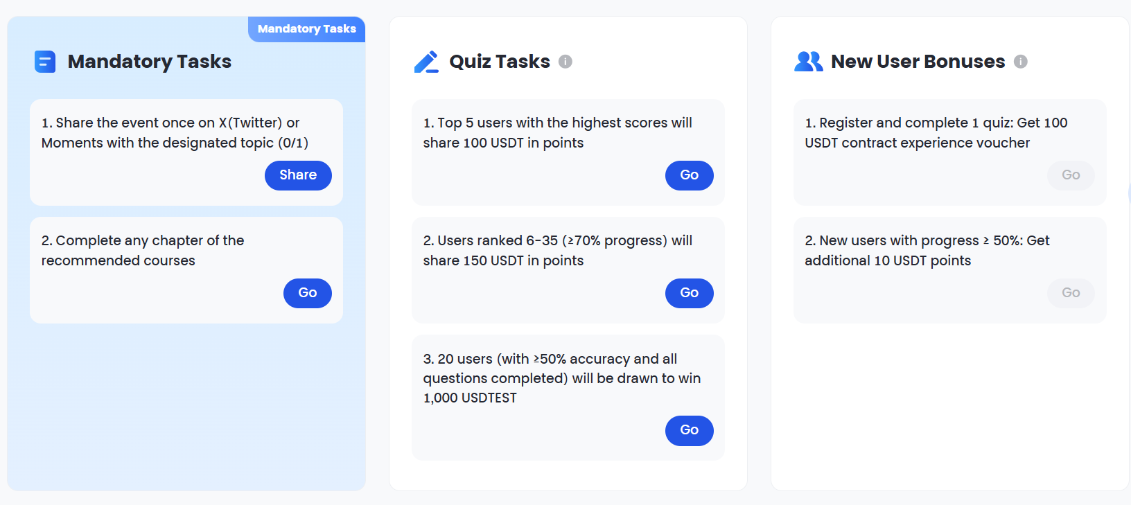 Serão lançadas um total de 50 perguntas de quiz ao longo do evento. No final, as recompensas serão distribuídas com base no progresso e na precisão dos participantes. O prêmio inclui um pool de recompensas de 500 USDT em cartões de pontos, 150 USDT em cartões de pontos e 20.000 USDTEST, entre outras recompensas emocionantes.