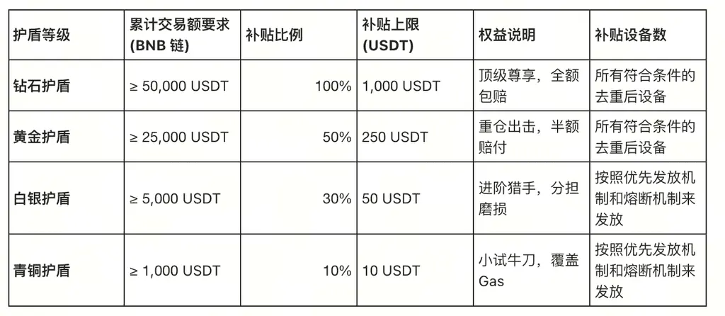 Durante a campanha, ao negociar tokens da BNB Chain no Meme Go, o sistema determinará o “nível de escudo” com base no volume total de negociação do utilizador durante a campanha. Se, no final, o utilizador estiver em situação líquida de perda, o subsídio será atribuído de acordo com o nível correspondente e os respectivos limites.
