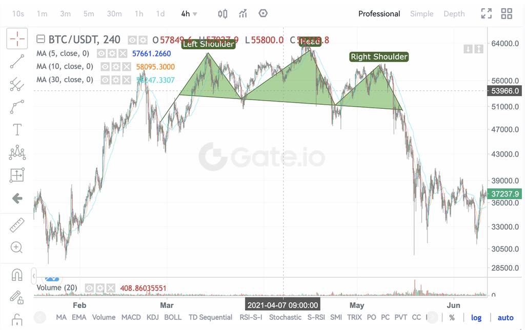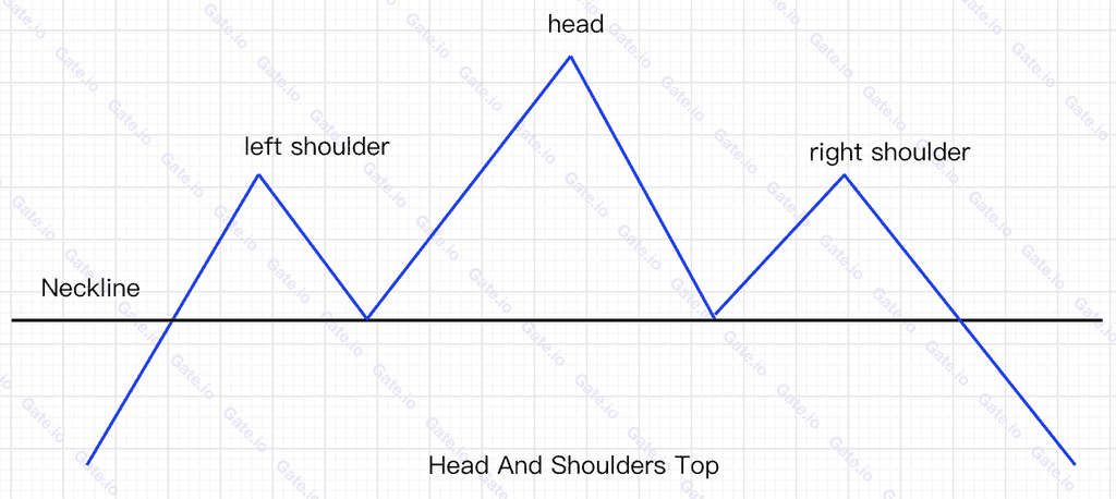 ②. It often manifests in the final stages of a market's ascent, during which the price undergoes significant fluctuations to form three distinct peaks. Notably, the left and right peaks are approximately at the same level, termed the left and right shoulders, respectively. The central peak, the tallest of the trio, is identified as the head.