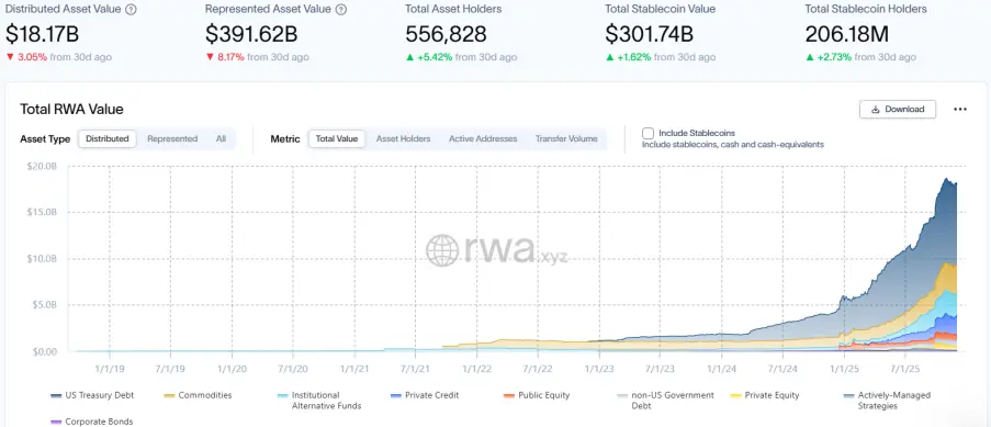 Possivelmente devido ao ajustamento dos critérios estatísticos, os dados mais recentes da RWA.xyz revelam que, até 5 de dezembro de 2025, a capitalização total em cadeia dos RWAs é de 18,17 mil milhões de dólares, uma ligeira diminuição de 3,05% face ao mesmo período do mês anterior. O número total de detentores de ativos aumentou para cerca de 556.800, um crescimento de 5,42% em relação ao mês anterior.