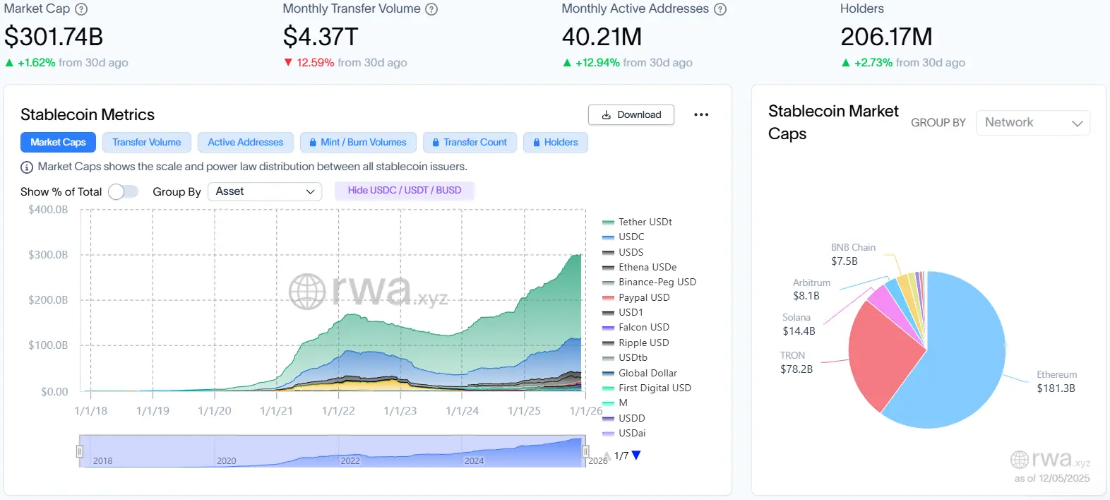 A capitalização total de stablecoins atingiu 301,74 mil milhões de dólares, um aumento marginal de 1,62% face ao mês anterior, com o ritmo de crescimento a recuperar ligeiramente mas ainda em níveis baixos, indicando falta de dinamismo na expansão da escala global. O volume mensal de transferências caiu para 4,37 biliões de dólares, uma descida de 12,59% em relação ao mês anterior, mostrando uma contração significativa. O número total de endereços ativos mensais subiu para 40,21 milhões, mas com uma queda de 12,04% face ao período anterior. O número total de detentores cresceu de forma estável para cerca de 206 milhões, um acréscimo de 2,73% face ao mês anterior. Estes dois indicadores mostram uma divergência estrutural, refletindo um mercado que mantém atividade, mas com uma eficiência de circulação de capital em fase de ajustamento. Apesar do aumento de novos utilizadores e de atividade no stock, a procura por liquidações de grandes montantes ou transações de alta frequência diminuiu. Os dados sugerem que o mercado está a passar de uma fase de crescimento acelerado impulsionado pela eficiência para uma nova normalidade centrada na penetração de utilizadores e consolidação do ecossistema. As principais stablecoins são USDT, USDC e USDS: o USDT registou um aumento marginal de 1,05% na capitalização face ao mês anterior; o USDC subiu 3,81%; e o USDS cresceu 2,02%.