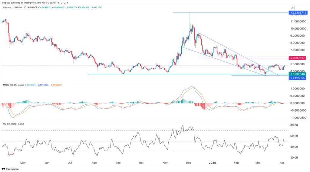 Индекс относительной силы поднялся выше нейтральной точки на уровне 50, в то время как индикатор MACD поднялся выше нулевой линии. Кроме того, цена токена ATOM также сформировала паттерн двойного дна на уровне $3.6, линия шеи которого находится на уровне $10.62.