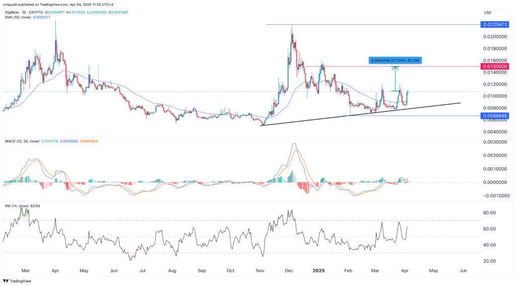 Токен DigiByte восстановился за последние несколько дней, несмотря на падение других токенов. Он вырос с минимума $0.0066 в январе до максимума $0.011 сегодня. Он поднялся выше 50-дневной скользящей средней и восходящей трендовой линии, которая соединяет самые низкие колебания с ноября прошлого года.