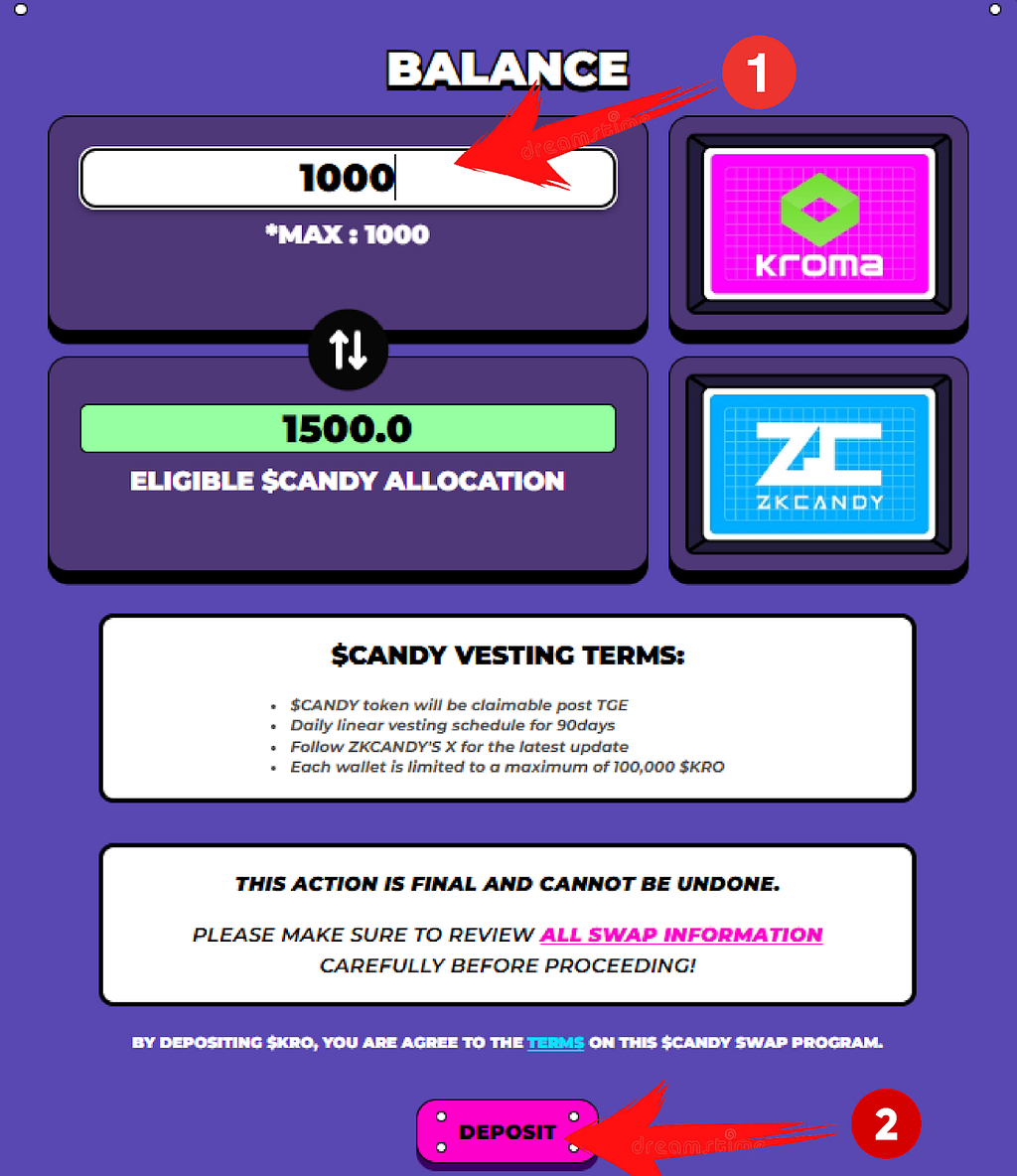 Посетите kroswap.zkcandy.io для завершения обмена вашего $KRO на $CANDY.