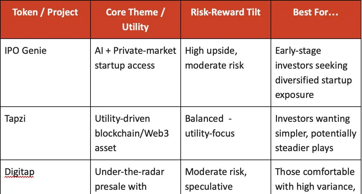 Если вы ищете крупную ставку со структурным преимуществом — а не просто хайп — IPO Genie выглядит как самый яркий кандидат: основанный на данных, ориентированный на доступ к стартапам и хорошо вписывающийся в общерыночные тренды. Tapzi и Digitap также могут стать интересным хеджем, особенно если вы диверсифицируете портфель и не вкладываете всё в один проект.