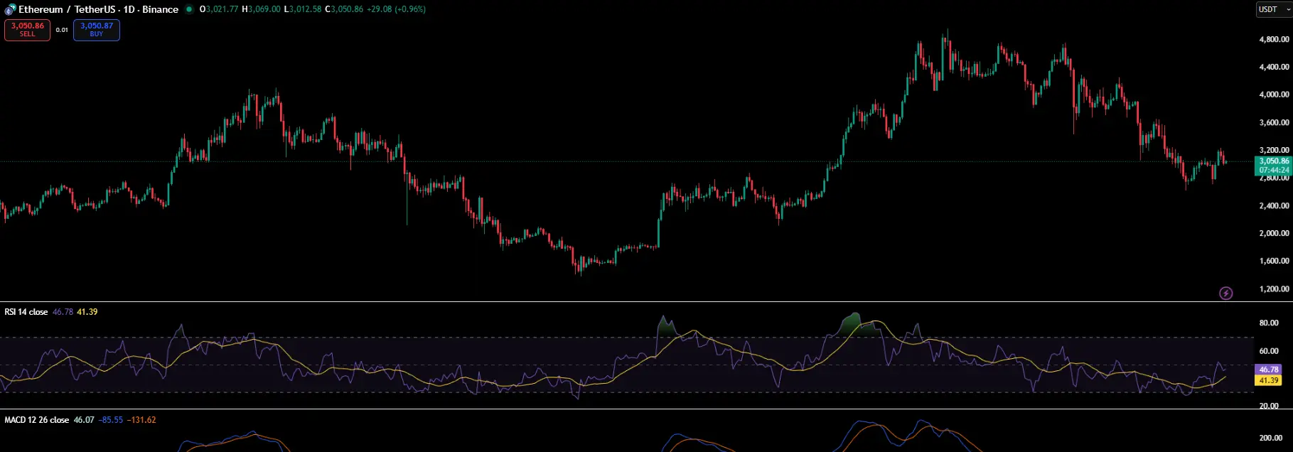 Ethereum торгуется около $3,000, при этом RSI и MACD демонстрируют нейтральную динамику вместо ярко выраженного тренда.