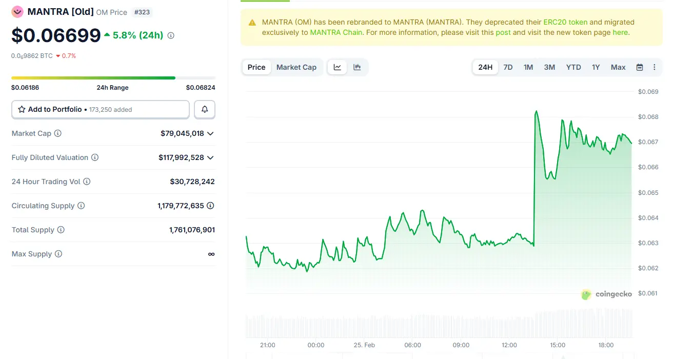 График цены MANTRA (OM) | Источник: Coingecko Этот скачок активности связан с подготовкой проекта к завершению перехода с OM на MANTRA, что изменит структуру и идентичность токена.