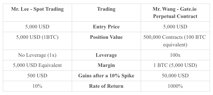Şu anki Bitcoin fiyatı 5000 USD. Bay Lee ve Bay Wang, Bitcoin fiyatı konusunda iyimserler. Bay Lee, spot piyasada 1 BTC satın alıyor. Bay Wang, 100x kaldıraçla 500.000 sürekli sözleşme (100 BTC eşdeğeri) satın almak için marj olarak 1 BTC kullanıyor. BTC fiyatı 5500 USD'ye yükselirse, Bay Lee %10'luk bir getiri oranı olan 500 USD kazanırken, Bay Wang %1000'lik bir getiri oranı olan 10 BTC eşdeğeri kazanacak