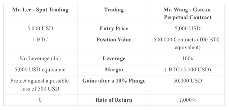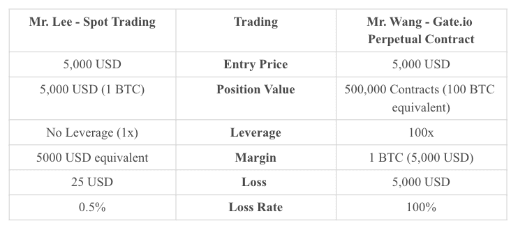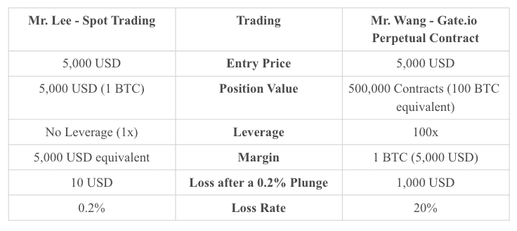 BTC fiyatı şu anda 5.000 USD. Bay Lee ve Bay Wang, BTC fiyatının yükselmesini bekliyor. Bay Lee, spot piyasada 1 BTC satın alırken, Bay Wang, marj olarak 100x kaldıraçla 500.000 sürekli sözleşmede (100 BTC eşdeğeri) alım yapmayı seçiyor. Ne yazık ki, BTC fiyatı yükselmez ve daha sonra 4.990 USD'ye düşer. Bay Lee %0,2 kaybederken Bay Wang %20 kaybetti.