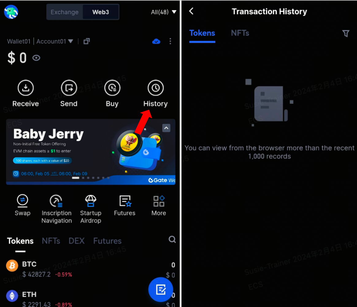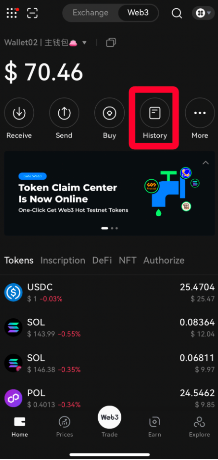 İşlem, aktardığınız token varlıkları yeterli ise ve şifre doğru şekilde doldurulmuşsa bekleyen onay durumuna girecektir. Siparişin tamamlandığını kontrol etmek için Web3 ana sayfasındaki "Geçmiş" sayfasına tıklayabilir ve "İşlem Geçmişi" sayfasına girebilirsiniz.
