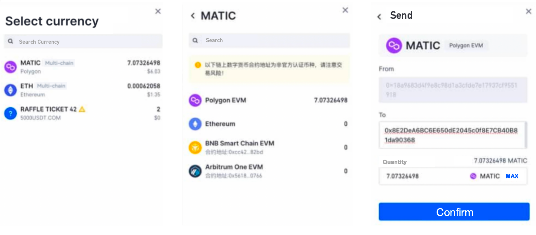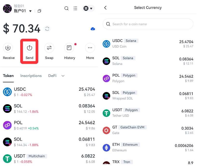 ① Sayfada “Gönder” düğmesine tıklayın, sayfa otomatik olarak sahip olduğunuz tüm token varlıklarını gösterecektir. Göndermek istediğiniz token varlığına tıklayın ve tokeni göndermek için cüzdan adresini seçin.