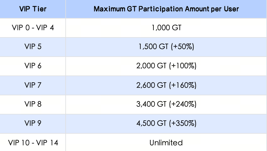 Hoàn tất xác minh danh tính và nắm giữ ít nhất 1 GT để chia sẻ tổng quỹ thưởng dựa trên tỷ lệ GT nắm giữ theo ảnh chụp nhanh. Đối với sự kiện này, mỗi người dùng VIP 0–VIP 4 có giới hạn tham gia là 1.000 GT. Người dùng VIP 10 trở lên có thể tham gia không giới hạn.