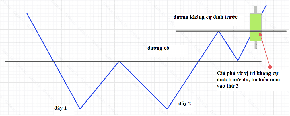 4.Cơ hội mua thứ ba từ hình dạng đáy kép: Sau khi giá đã quay về vị trí của đường cổ, và sau đó tiếp tục tăng và phá vỡ đỉnh trước đó. Nếu nến tăng bắt đầu từ vị trí trên vượt qua mức kháng cự đỉnh trước đó, đó là điểm mua vào thứ ba. Như trong hình dưới đây: