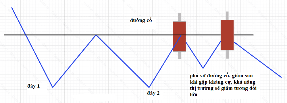 Mặc dù hình đáy kép đã hình thành, nhưng điều này không đảm bảo rằng việc tăng giá sau đó sẽ không gặp trở ngại. Một khi giá quay lại vị trí hỗ trợ của đường cổ và sau đó phá vỡ đường cổ với một nến đỏ, đây là dấu hiệu dự báo của cơn bão sắp đến, tạo thành tín hiệu bán ra, và có khả năng cao rằng thị trường sẽ tiếp tục xu hướng giảm như được minh họa trong biểu đồ.