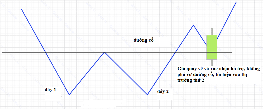 Khi hình đáy kép sắp hình thành, sau khi quay lại tạo ra điểm đáy thấp thứ hai và bắt đầu phục hồi, giá phá vỡ đường cổ và tạo nến xanh lớn, đây là điểm mua vào thứ nhất, với khả năng tiếp tục tăng trong tương lai. Như được thể hiện trong hình dưới đây: