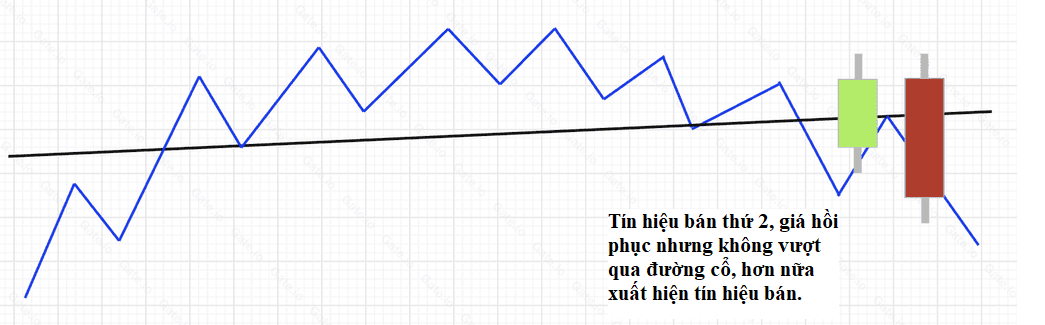 B.Khi giá tiền giảm xuống dưới đường cổ lần thứ hai và có tăng trở lại, nhưng đỉnh không vượt qua đường cổ, và xuất hiện các tín hiệu tiêu cực, điểm bán ra thứ hai xuất hiện, loại điểm này thuộc loại ổn định hơn và tỷ lệ thành công được cải thiện rõ rệt.