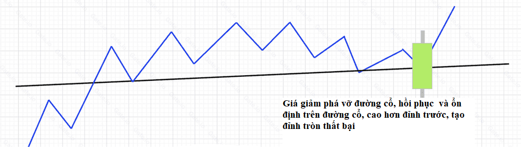 Khi giá giảm xuống dưới đường cổ sau đó nhanh chóng phục hồi lên trên đường cổ, việc phá vỡ đường cổ thất bại, việc xây dựng đỉnh tròn thất bại. Lúc này, bạn có thể tiếp tục giữ vị thế và quan sát, sau đó quyết định liệu có cần rời khỏi thị trường dựa trên các chỉ báo xu hướng hay không.
