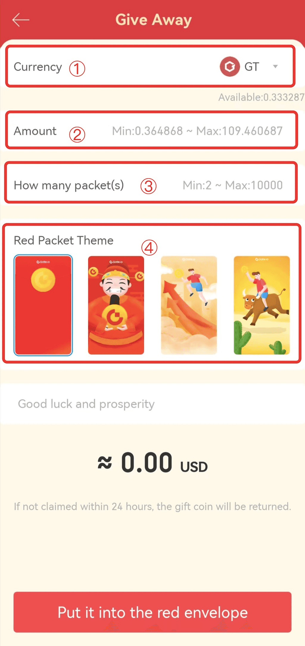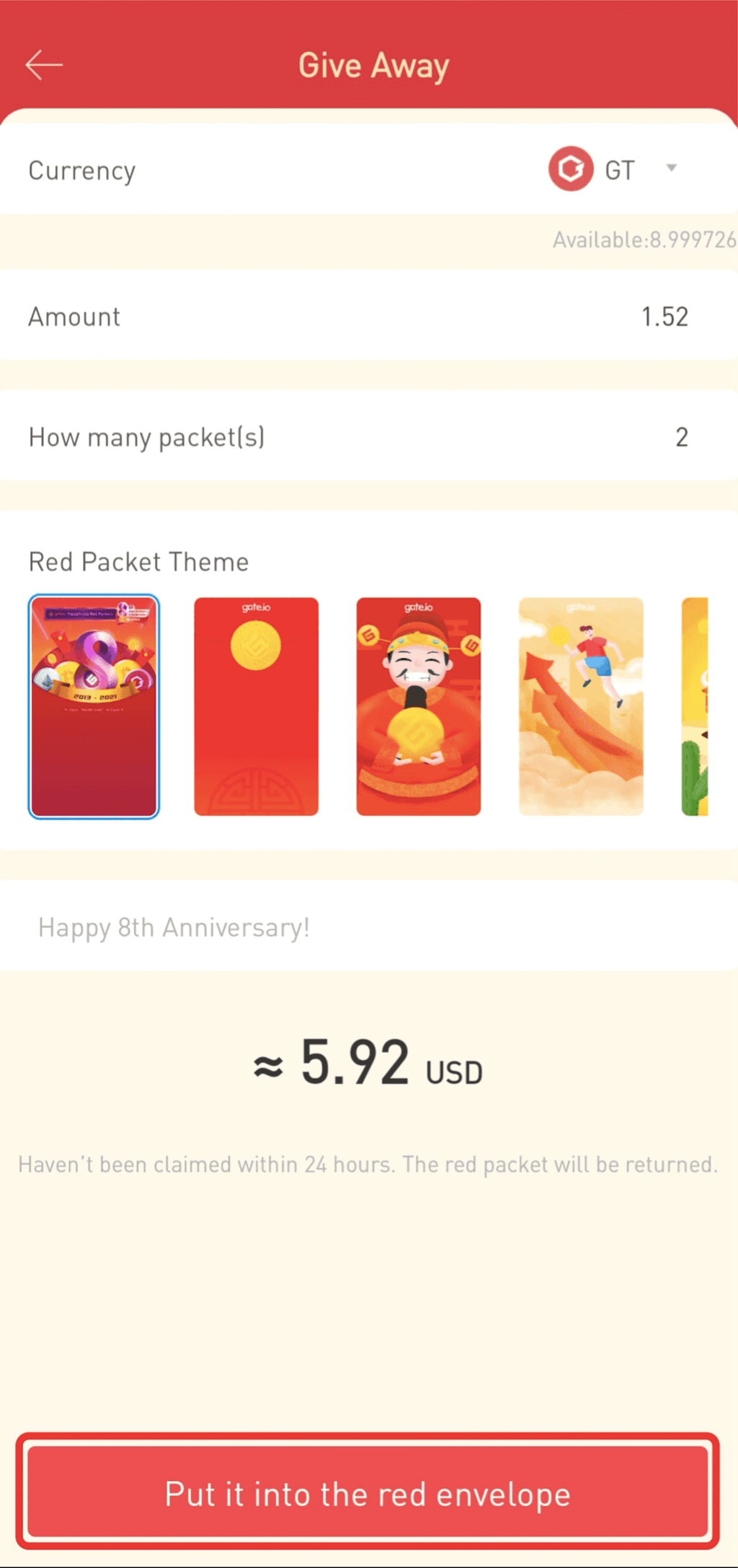 Ví dụ: gửi 2 lì xì với tổng số tiền là 1,52 USDT và chọn chủ đề "Cung hỷ phát tài, đại phát đại lợi"