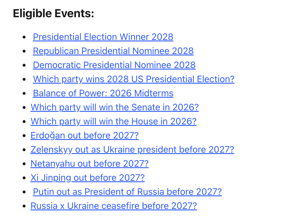 Ví dụ, khối lượng giao dịch cao nhất lại là ngôi sao NBA LeBron James (LeBron James, khối lượng 48,41 triệu USD), theo sau là nữ minh tinh trong giới giải trí Kim Kardashian (Kim Kardashian, khối lượng 33,84 triệu USD), rồi thậm chí còn có những ứng viên hoàn toàn không có quốc tịch Mỹ (không phù hợp quy định tranh cử), như tỷ phú Elon Musk (Elon Musk, khối lượng 23,14 triệu USD), Thị trưởng New York Zohran Mamdani (khối lượng 18,39 triệu USD)…