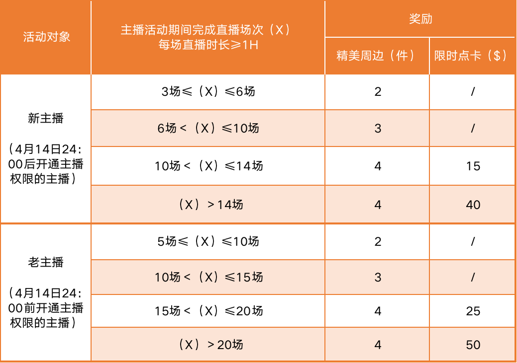 2022年4月15日-2022年5月15日期间,主播完成不同的直播场次即可获得不同的奖励,并且活动无需报名,新老主播开播即视为有效参与,具体奖励规则如下: