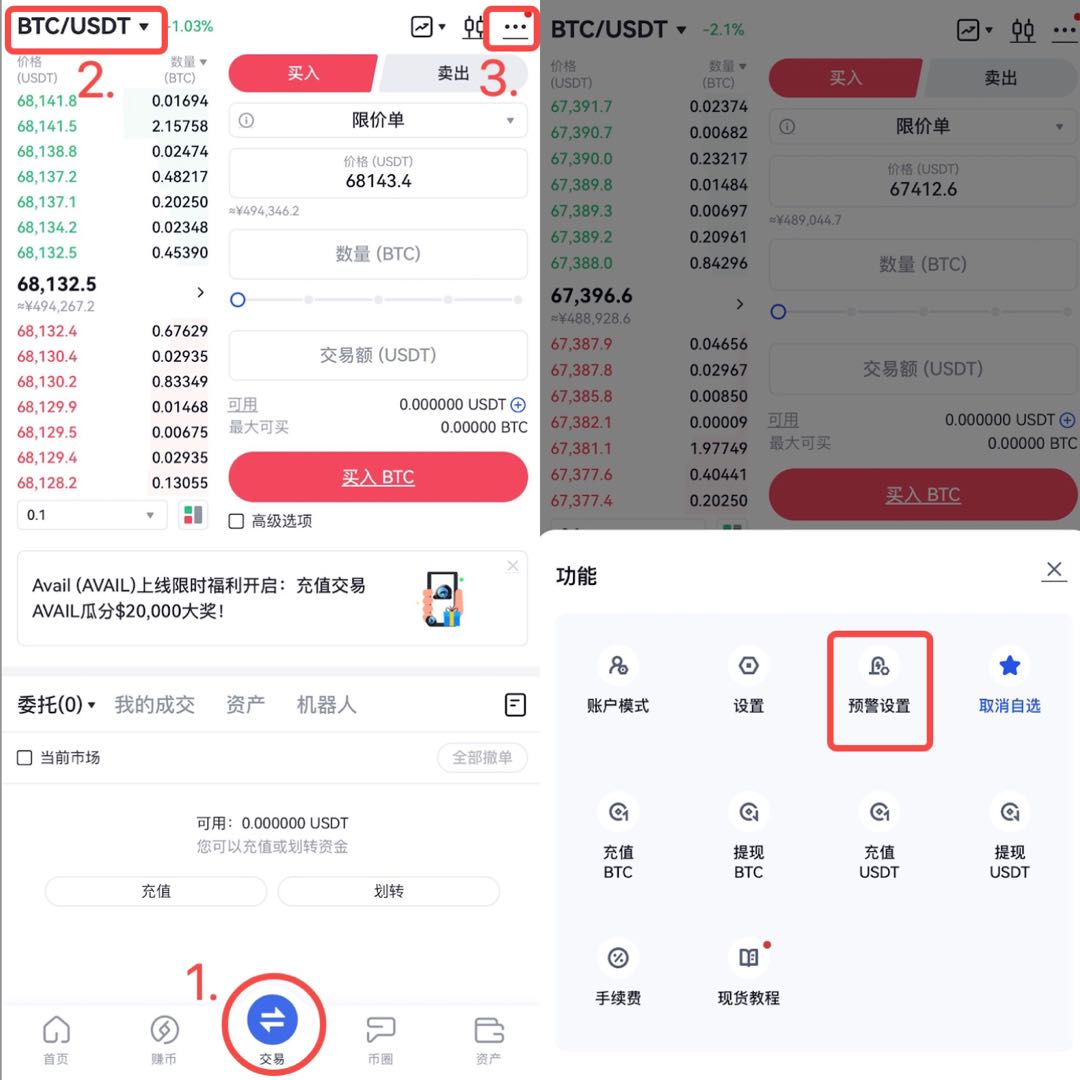 第一步:點擊 App 下方導航欄的 “交易” 選擇 “現貨” 搜索要添加預警的交易對,點擊右上角 “…” 符號,在 “功能” 面板選擇 “預警設置”,進入預警設置界面。
