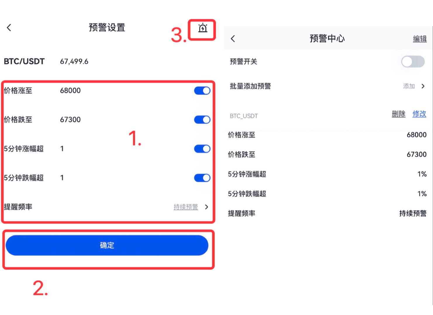 設置好後,可點擊頁面右上角的 “預警符號” 查看添加的預警,也進行修改與刪除,同時在此界面確認是否打開 “預警開關”。