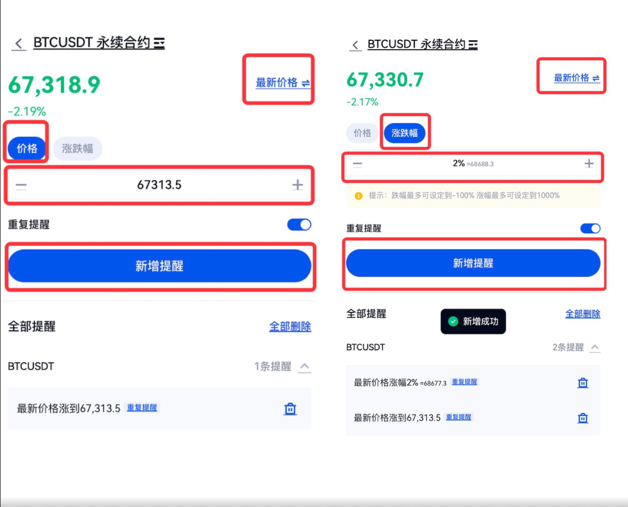 合約可選擇 “最新價格” 或 “標記價格” 預警,然後設定 “價格”、“漲跌幅” 預警參數,設定完成後如需刪除,可在頁面下刪除。
