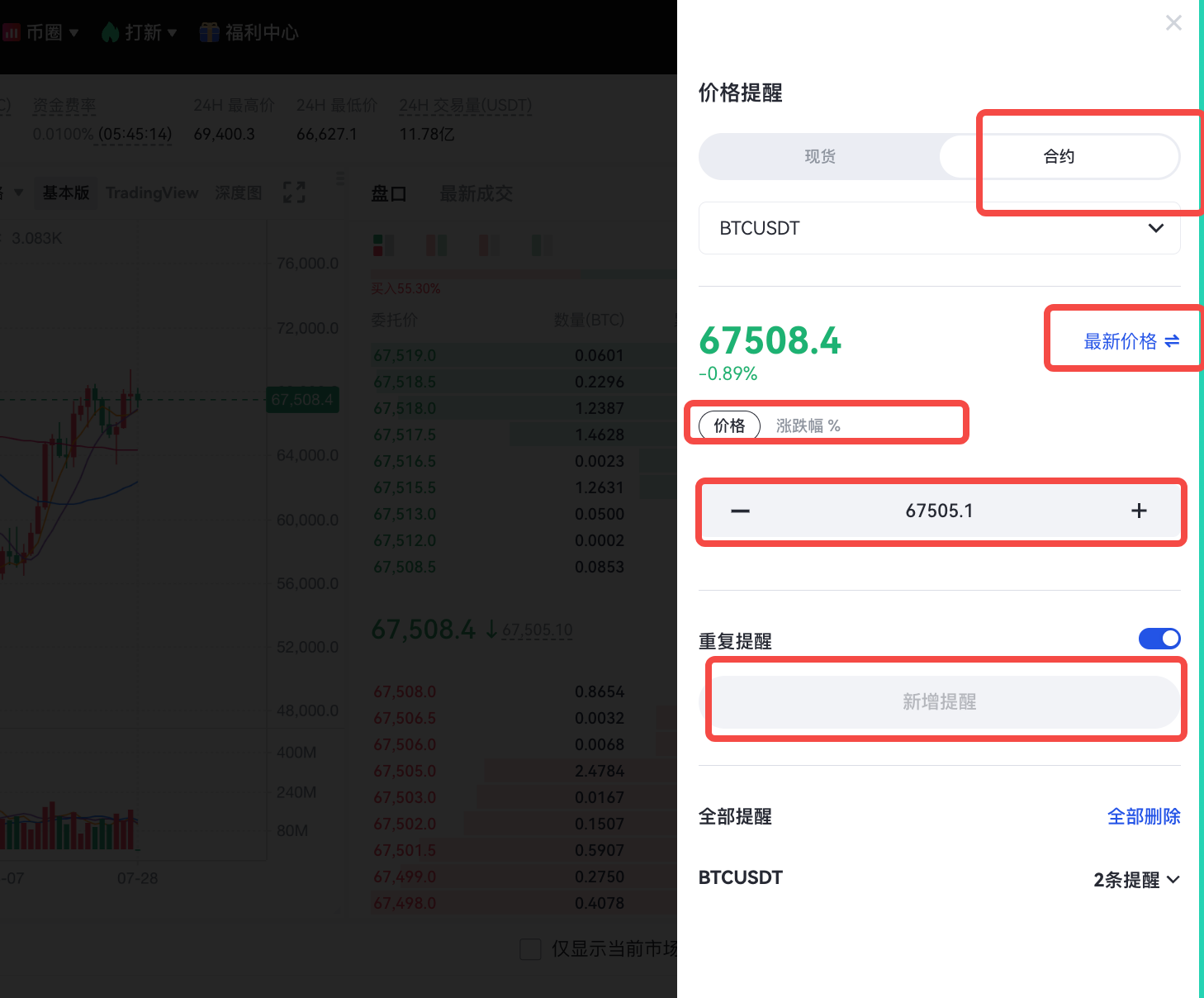 2.選擇“合約” - “選擇交易對”,合約可選擇 “最新價格” 或 “標記價格” 預警、設置 “價格”、“漲跌幅” 預警參數,點擊新增預警即可。