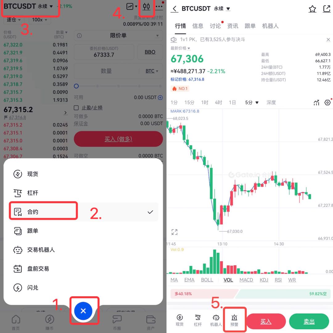點擊 App 下方導航欄的 “交易” - “合約” 搜索要添加預警的交易對,點擊右上角 “K線柱” 符號,進入行情界面,進入行情界面,點擊頁面下方的 “預警” 按鈕,進入預警設置界面。