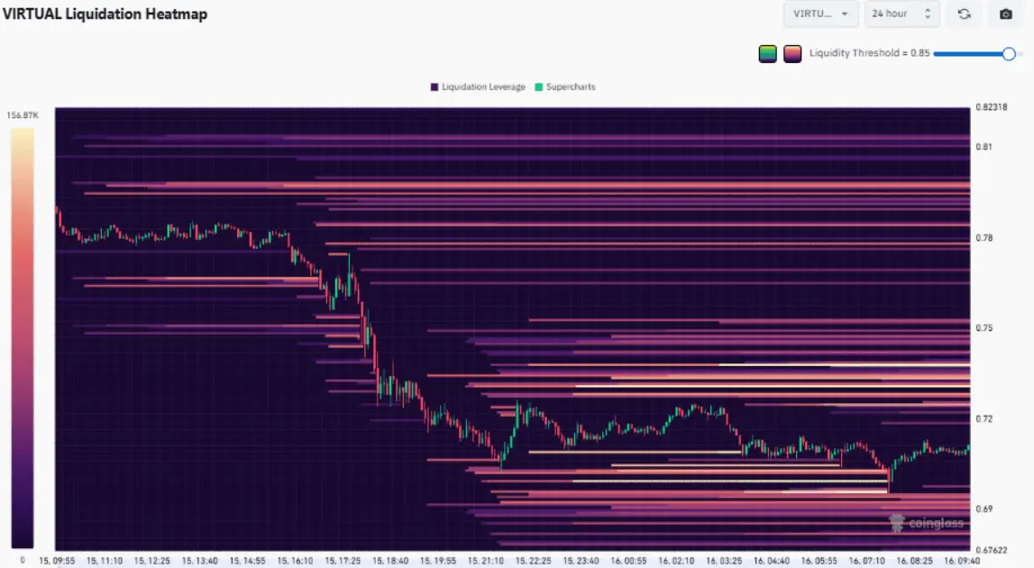 值得注意的是,VIRTUAL目前被“夾”在兩個重要的流動性區域之間,且動能偏向積極。然而,持續在0.70美元附近積累的流動性仍可能成為短期的阻力,限制上漲幅度。
