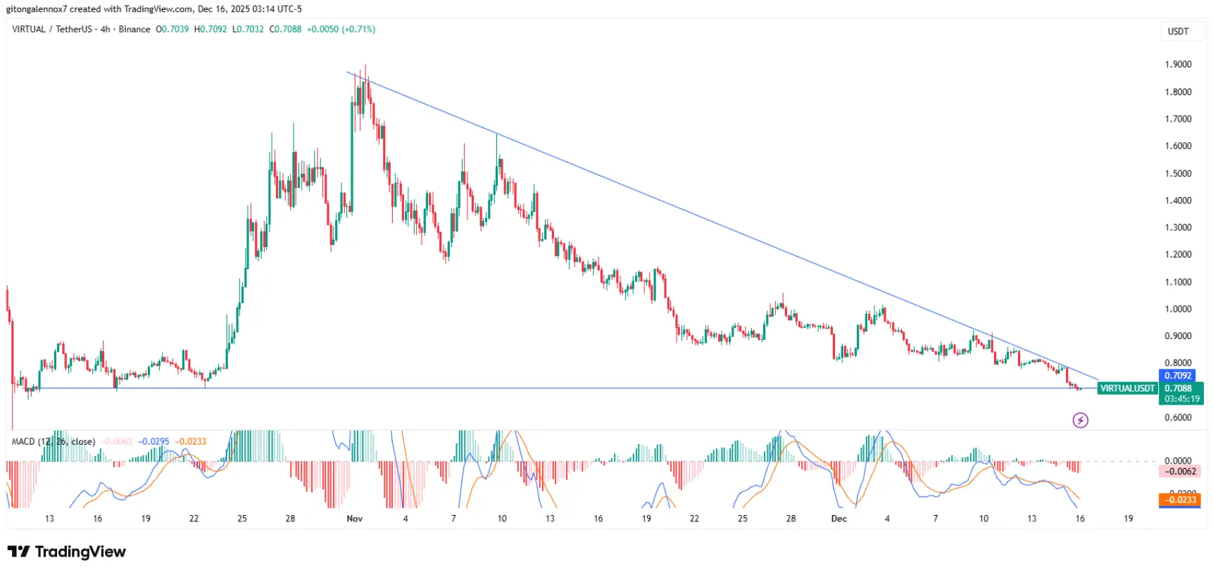 價格圖表顯示,VIRTUAL 自11月1日起正式進入持續下跌的趨勢。這次調整延續了一次短暫的技術反彈,出現在10月10日大幅下跌約十天後,但很快未能扭轉整體趨勢。
