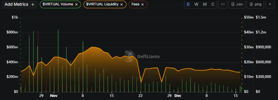 根據CoinMarketCap的數據,持幣人數在過去一周內減少,目前約為103萬。這種壓力在交易量上表現得更為明顯:自11月初以來,VIRTUAL的交易價值從約10億美元暴跌至約8000萬美元,跌幅超過10倍。而流動性也有所下降,約減少50%,至1300萬美元。