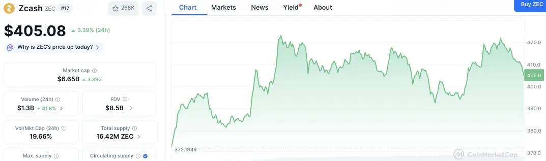 除費用討論外,ZEC 價格持續上升。截稿時該資產報價 $405.08,過去 24 小時上漲 3.39%,市值增至 $66.5 億。