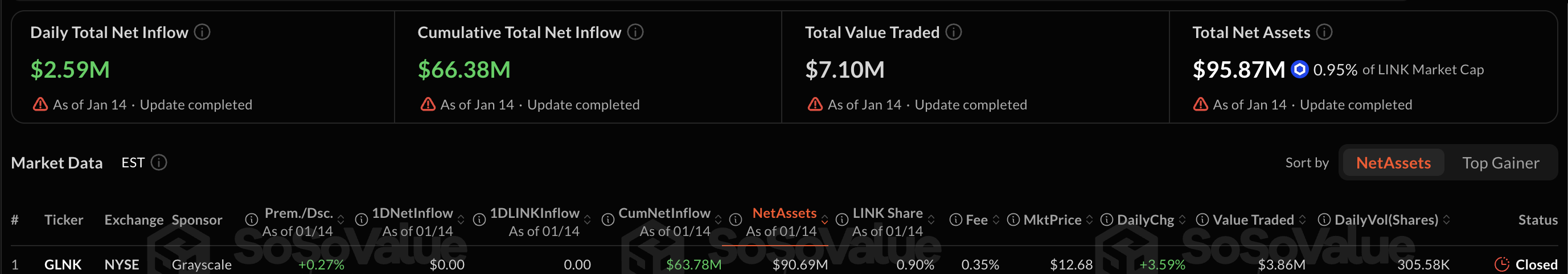 此次推出標誌著第二個直接與 LINK 相關的美國現貨ETF。Grayscale 的 Chainlink Trust ETF (GLNK),於12月初推出,首日吸引了3705萬美元的資金流入。