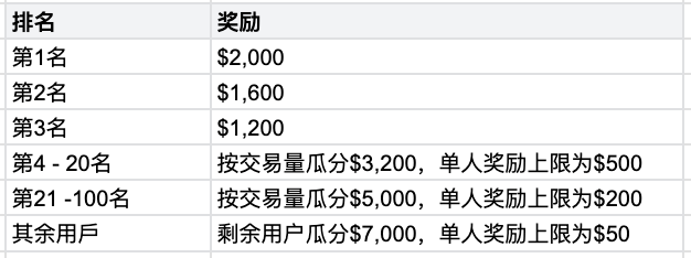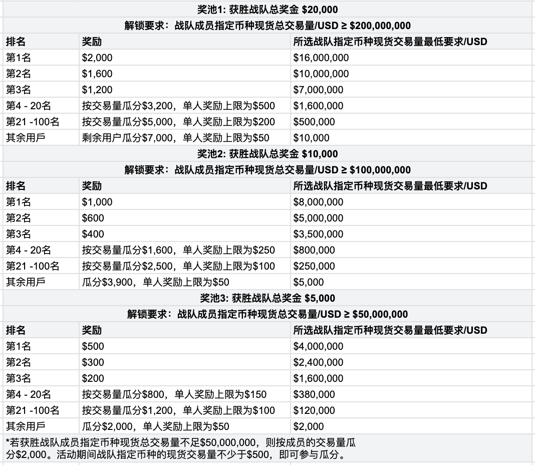 活动期间所有加入战队用户,不论战队是否获胜,完成不低于$100战队指定币种现货交易,即可按照用户现货交易量占比瓜分$2,000奖励。