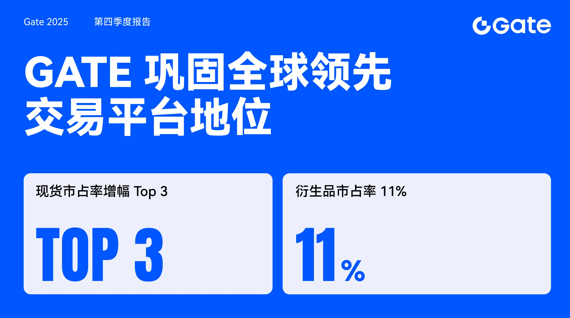 2025 年第四季度,Gate 延续全年以来的强劲增长态势,现货与衍生品业务双线保持高位运行,交易深度、流动性与用户活跃度持续位居行业前列。根据 CoinDesk 最新数据,Gate 在现货市场的全球市占率增幅稳居前三,衍生品市占率提升至 11%,为同期增幅最高的交易平台。