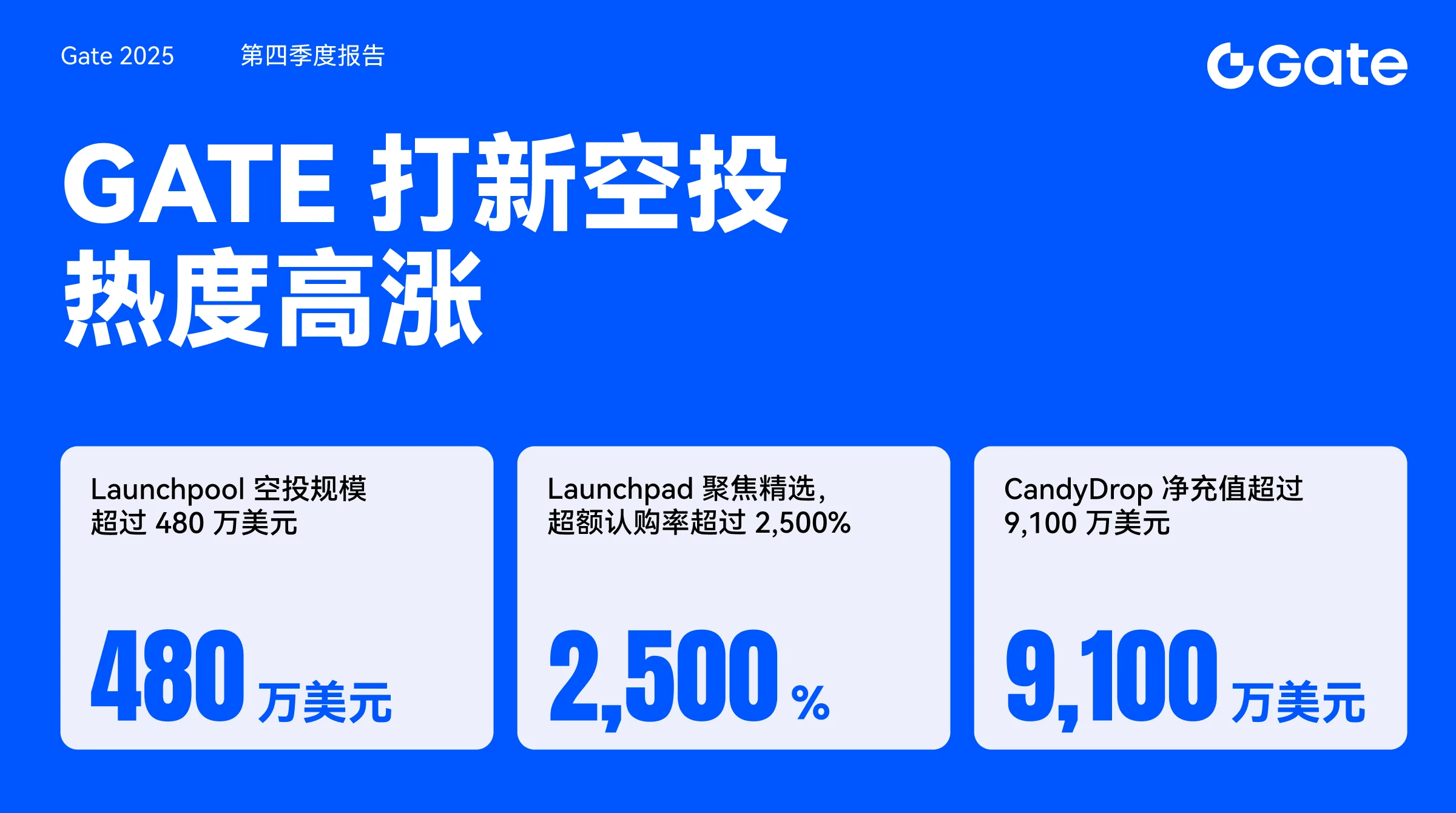 生态与产品层面,Gate 围绕 Launchpool、Launchpad、HODLer Airdrop 与 CandyDrop 等机制持续放量,逐步形成“项目供给—用户参与—资金沉淀”的增长闭环。第四季度内,Launchpool 上线 28 个项目、累计空投规模超 480 万美元;Launchpad 季度超额认购规模达 1.49 亿美元;CandyDrop 累计合约交易量突破 510 亿美元。链上侧,Meme Go 承接链上热点交易需求;链上赚币、ETF、跟单与量化基金等多元产品线同步推进,配合 Gate App v8.0 升级,持续提升用户交易效率与全球化体验。
