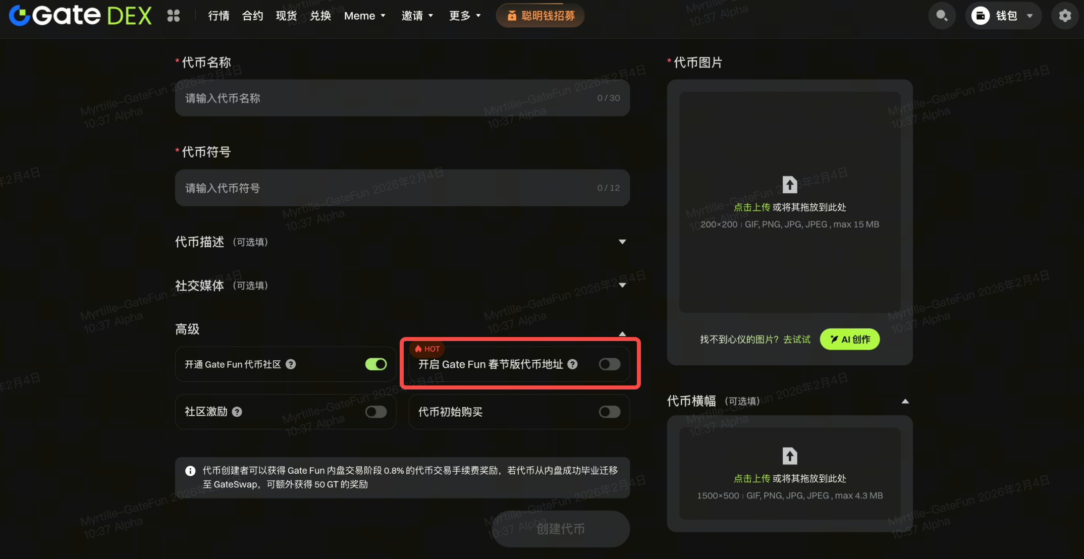 - 时效限制:2026 年 3 月 3 日后,系统将⾃动移除“开启 Gate Fun 春节版代币地址”选项,恢复默认的随机地址⽣成规则;