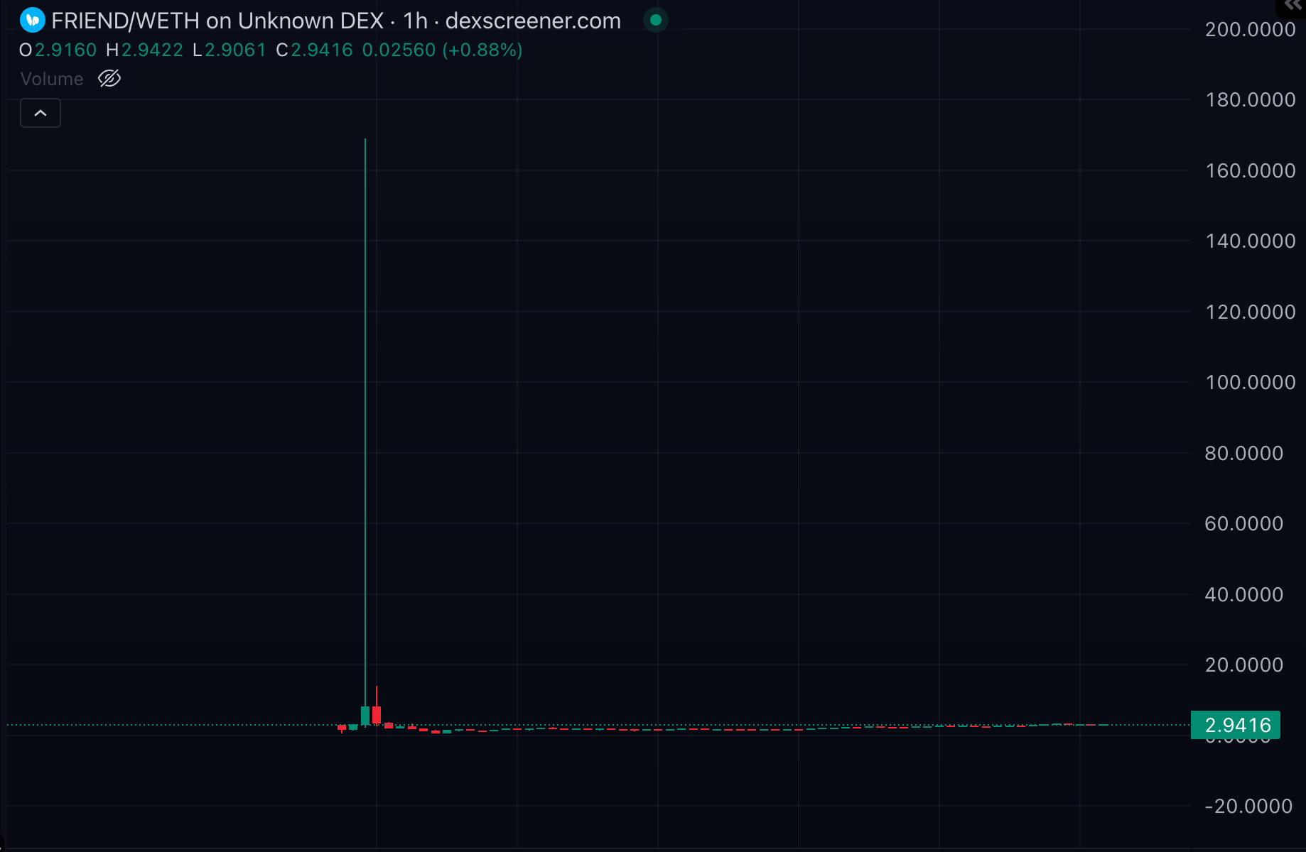 作为 The Graph 正如所示,FRIEND价格仅在短时间内飙升。这就是为什么像CoinGecko和CoinMarketCap这样的其他加密分析公司没有表明的原因。 FRIEND代币价格 例如,数据显示,曾经上涨到169美元。 CoinGecko 显示在上线后,FRIEND的价格上涨到3.26美元,然后从峰值下跌了48.52%。