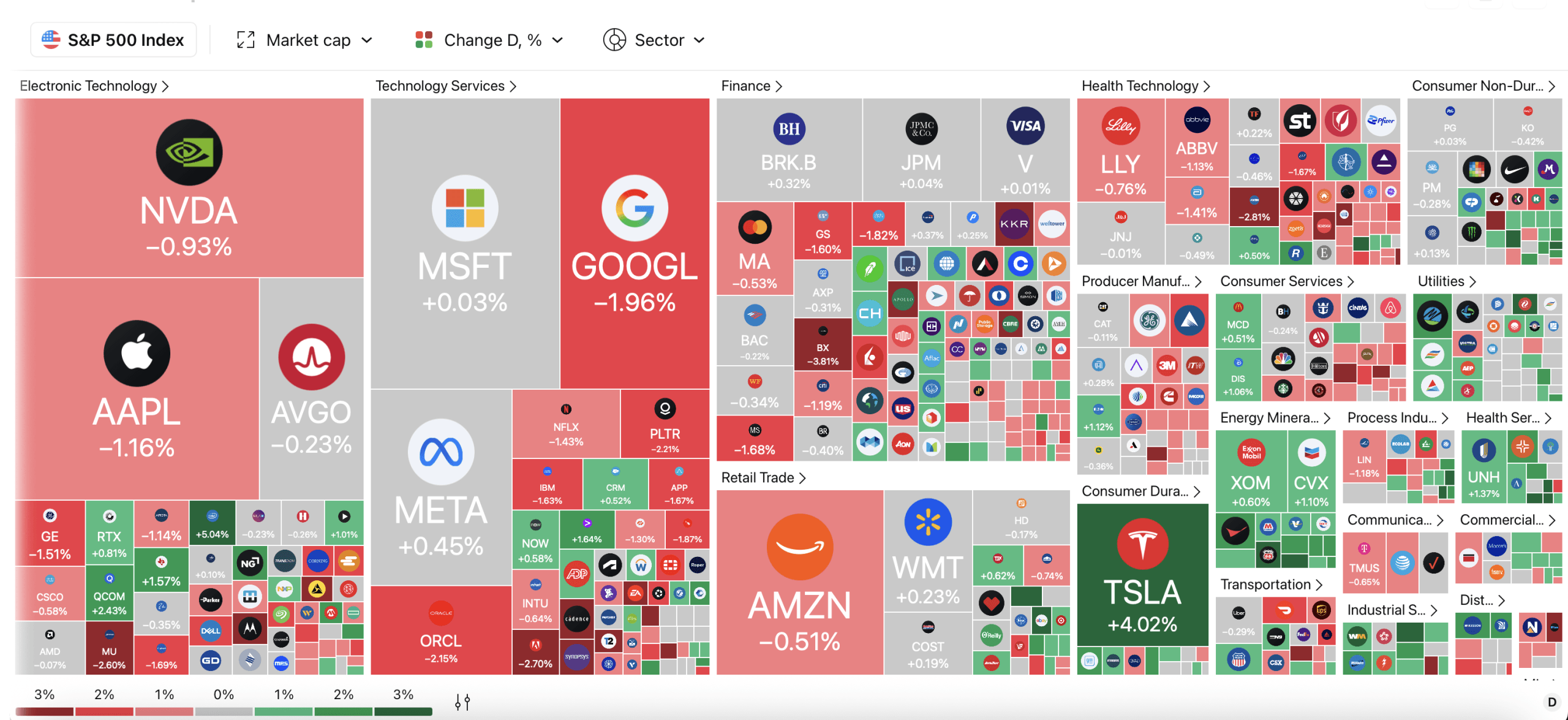 微软和Meta小幅上涨,而特斯拉则因4%的涨幅吸引了注意。能源和医疗保健行业则出现了一些上涨,但总体来看,今天的市场像是一片损失的拼贴,特斯拉是那罕见的亮点。