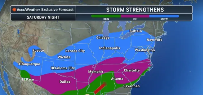 美国气象预报公司AccuWeather报道,一场“巨大冬季风暴”可能从德克萨斯州最西部延伸至中大西洋海岸,长达1800英里,导致多州停电、交通受阻,影响超过6000万人。